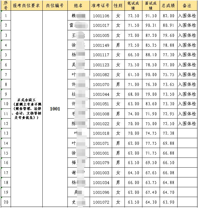 1.考生笔试、面试成绩各占50%,总成绩按报考岗位从高分到低分确定体检入围对象,入围比例为1:1.2;