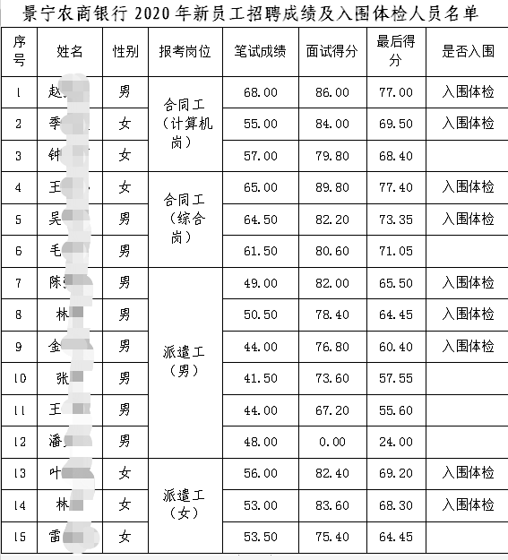 根据《浙江景宁农村商业银行股份有限公司2020年新员工招聘公告》要求,已完成笔试、面试,现将招聘面试成绩、总成绩及入围体检人员名单进行公示,具体公示事项如下: