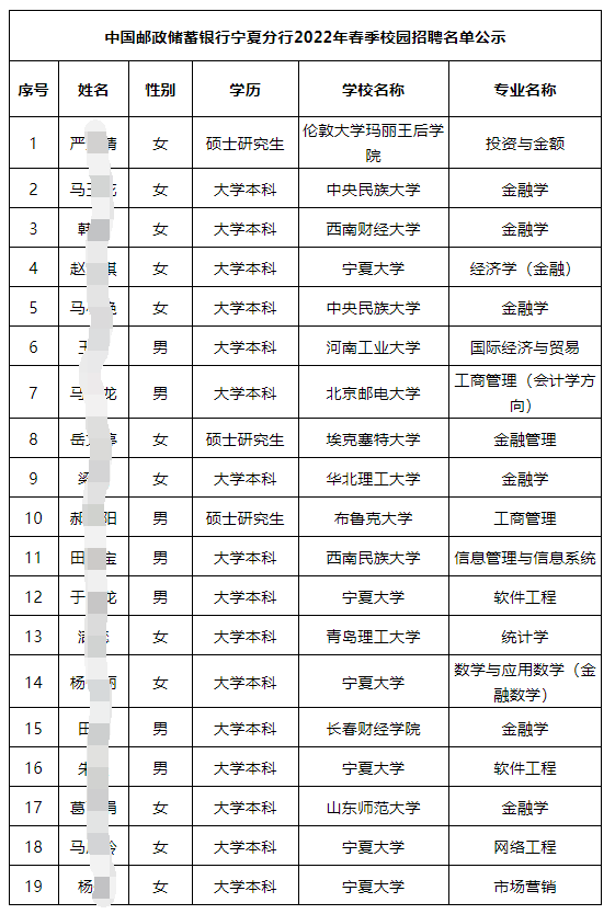 根据中国邮政储蓄银行宁夏分行2022年校园招聘工作计划,对武其乐、严文婧等40名应聘人员已完成笔试、面试等程序,现予以公示。如对拟录用人员有异议,请于5个工作日内(2022年6月24日至6月30日)以电话或书面形式向中国邮政储蓄银行宁夏区分行纪委办公室或人力资源部反映,所反映问题必须真实、准确,并署本人真实姓名和联系方式。