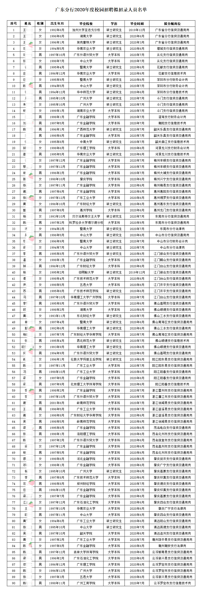 2020农业发展银行广东分行校园招聘拟招录人员名单