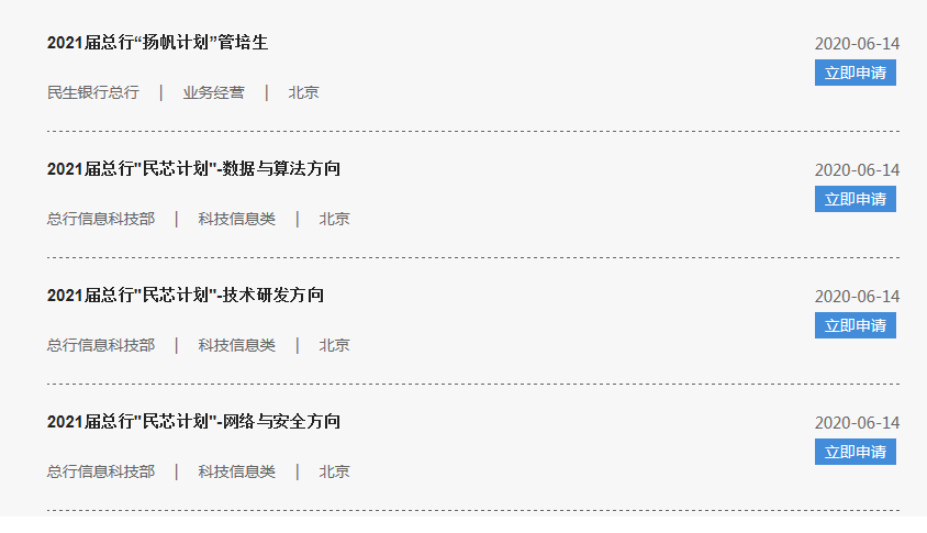 (二)简历投递:登录中国民生银行官网(www.cmbc.com.cn),点击底部“民生招聘”,或关注“民生银行招聘”微信公众号,注册个人信息,投递2021届“扬帆”管理培训生或“民芯计划”校园招聘相应职位。