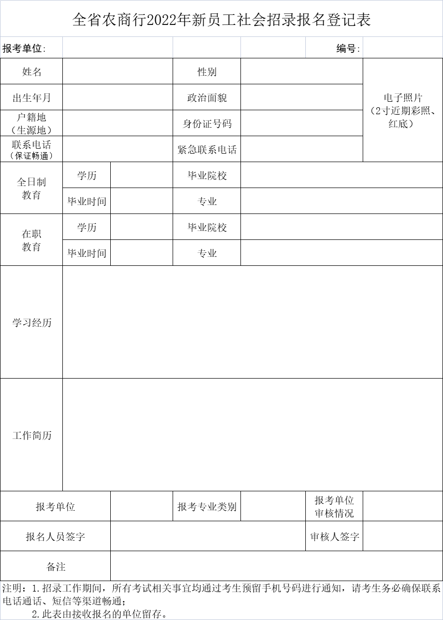 (一)网上报名。2022年10月25日10:00起,考生可登陆湖北农信社官网(网址:http://www.hbxh.com.cn/)查看招录公告和考生须知,准备相关资料,做好报名准备工作。10月26日9:00起,报名通道开启。10月26日10:00至30日17:30,考生登录湖北省人事考试网(网址:http://www.hbsrsksy.cn/),选择“全省农商行2022年新员工招录报名入口”,注册个人基本信息,上传本人近期免冠2寸正面证件电子照片后进行报名。考生报考时需认真选择报考单位和专业,报考单位和报考专业类型一经审核,不允许修改。
