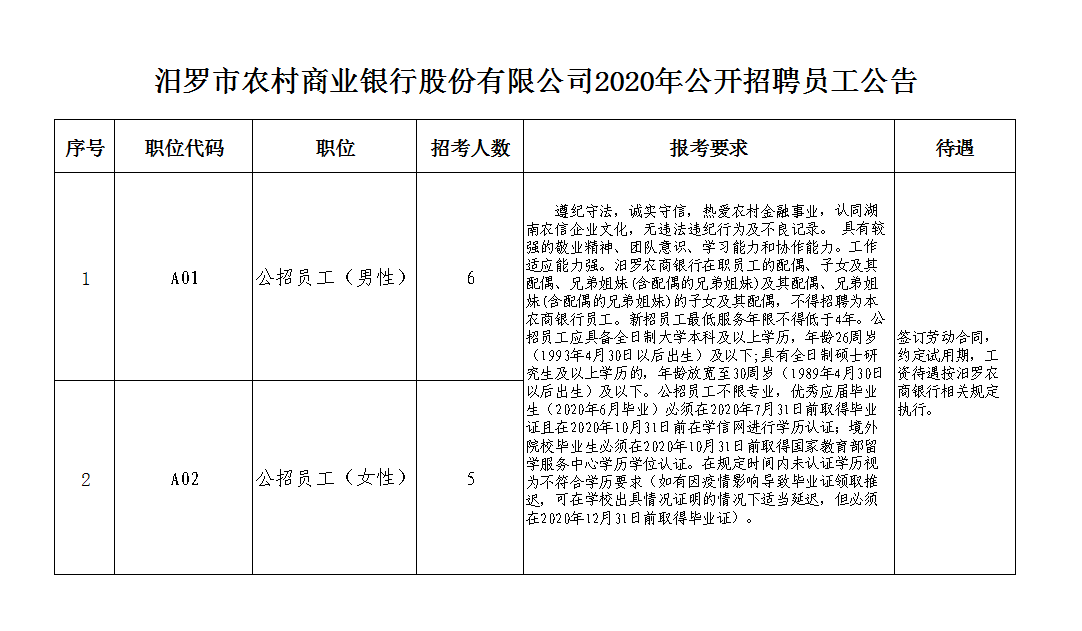 岳阳办事处审核备案,按要求与拟聘人员签订劳动合同,并约定试用期,工资待遇按汨罗农商银行相关规定执行。
