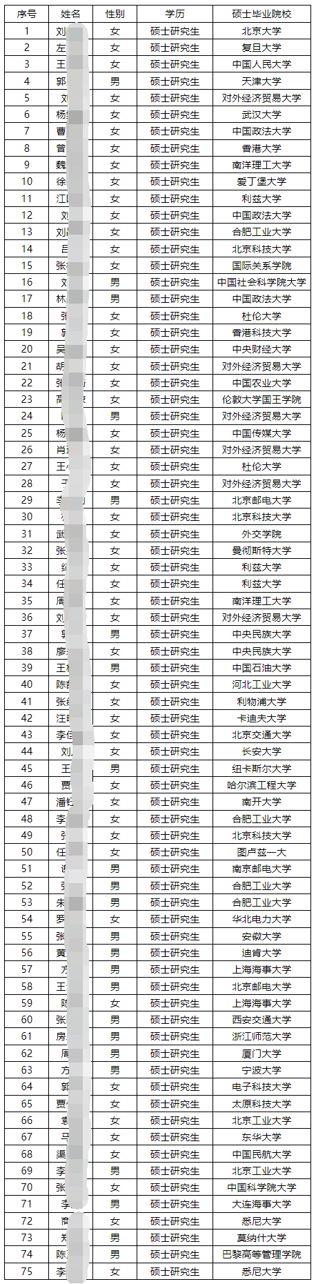 为贯彻落实《人力资源社会保障部关于国有企业招聘应届高校毕业生信息公开的意见》(人社部发[2014]79号)要求,现对2022年信用卡中心校园招聘拟录用人员情况予以公示,接受社会监督。具体情况见下表。