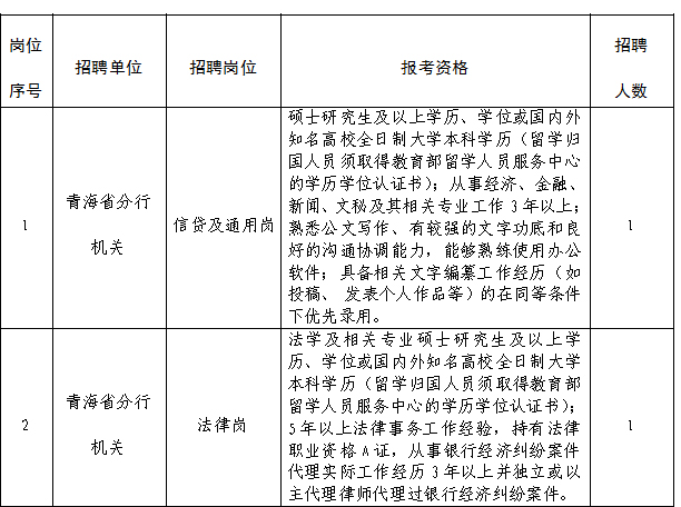 本次招聘单位为青海省分行机关,招聘岗位共2个,具体为: