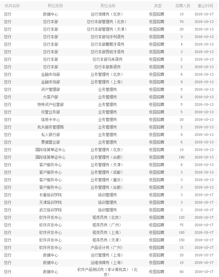 2.报名时间:9月28日-10月13日(其中软件开发中心,数据中心,长春、天津、武汉培训学院岗位报名时间为9月28日-10月17日)。
