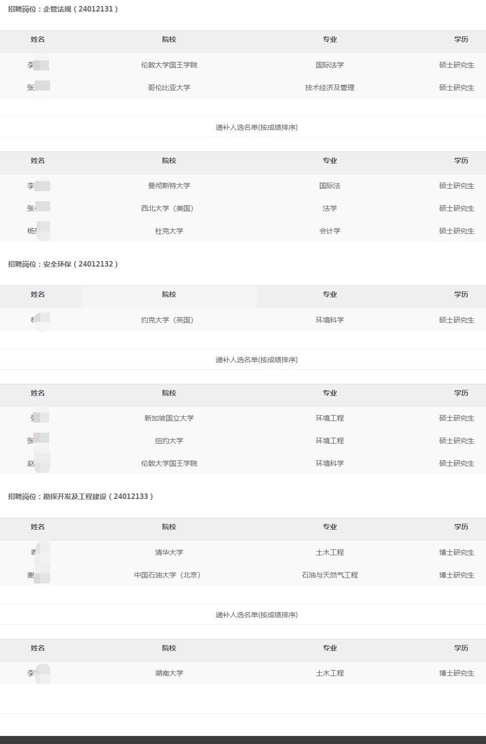 为增加高校毕业生招聘工作的透明度和公信力,进一步扩大民主、加强监督,根据中国石油高校毕业生招聘工作有关要求,经资格审查、专业考试、面试等程序,我单位提出以下拟录用人选,现将名单予以公示。