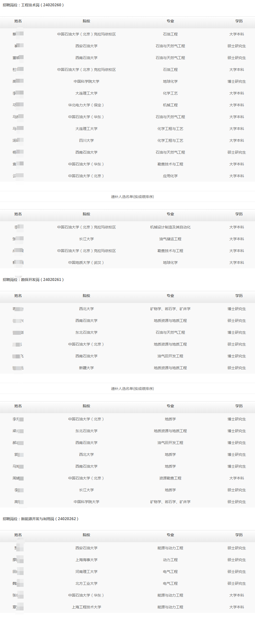 为增加高校毕业生招聘工作的透明度和公信力,进一步扩大民主、加强监督,根据中国石油高校毕业生招聘工作有关要求,经资格审查、专业考试、面试等程序,我单位提出以下拟录用人选,现将名单予以公示。