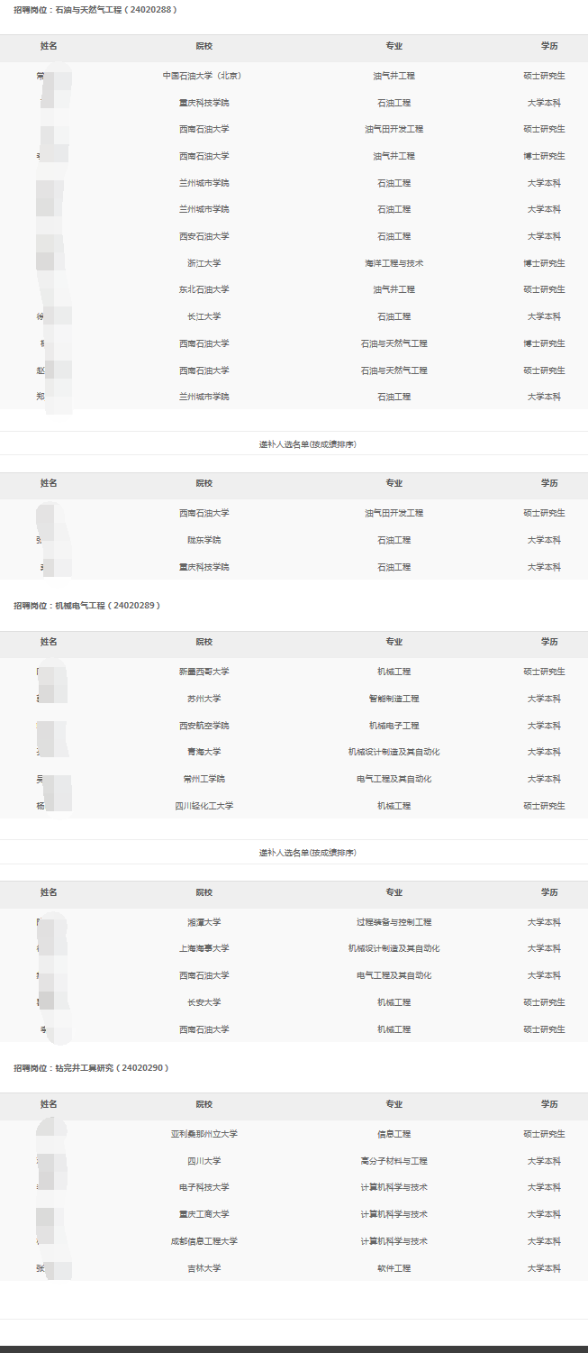 2024年川庆钻探工程春季高校毕业生招聘拟录用和递补人选公示