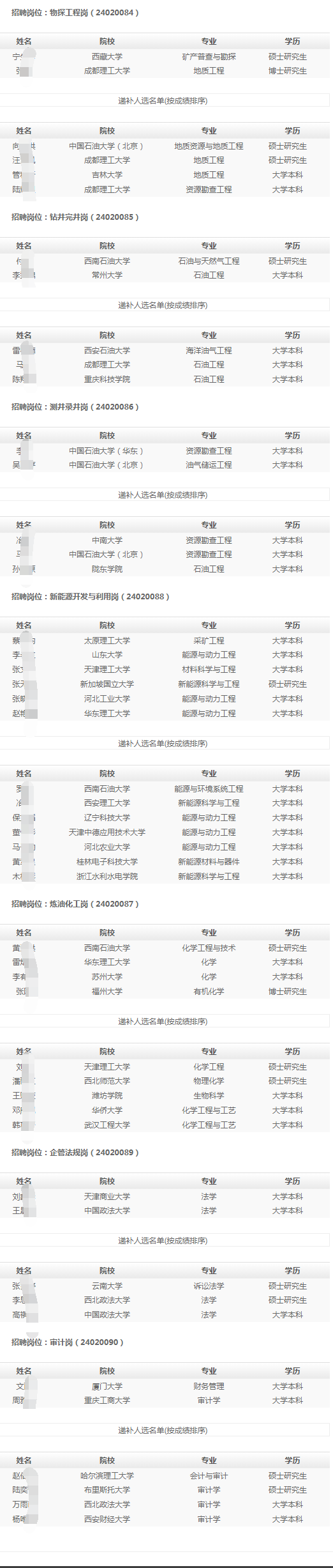 为增加高校毕业生招聘工作的透明度和公信力,进一步扩大民主、加强监督,根据中国石油高校毕业生招聘工作有关要求,经资格审查、专业考试、面试等程序,我单位提出以下拟录用人选,现将名单予以公示。