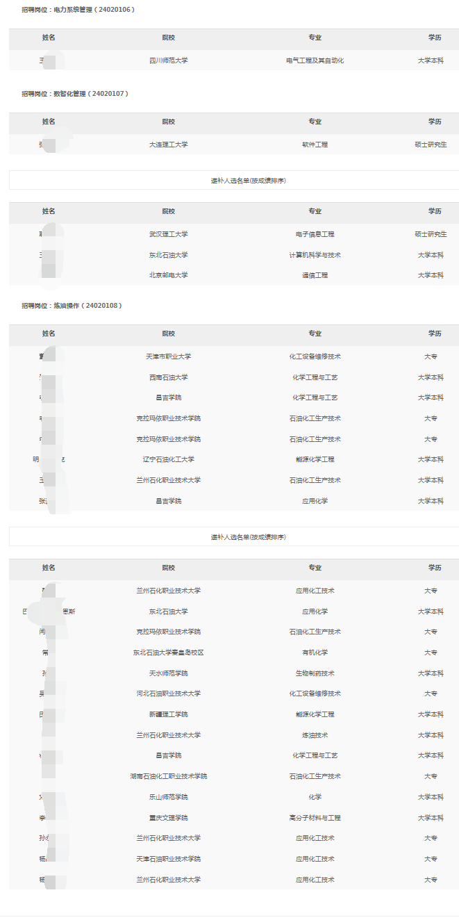 2024年中石油克拉玛依石化春季高校毕业生招聘拟录用和递补人选公示
