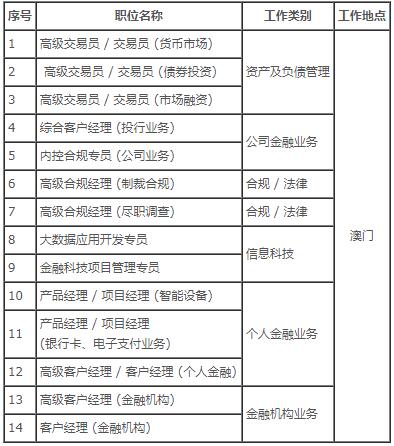 根据业务发展需要,中国银行股份有限公司澳门分行(以下简称“中国银行澳门分行”)部分职位现面向社会公开招聘,现就有关招聘事宜公告如下: