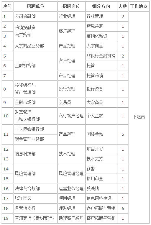 根据业务发展需要,中国银行股份有限公司上海市分行(以下简称“中国银行上海市分行或我行”)部分职位面向社会公开招聘,现就有关招聘事宜公告如下: