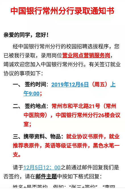 > [江苏]2020中国银行常州分行校园招聘录取通知书