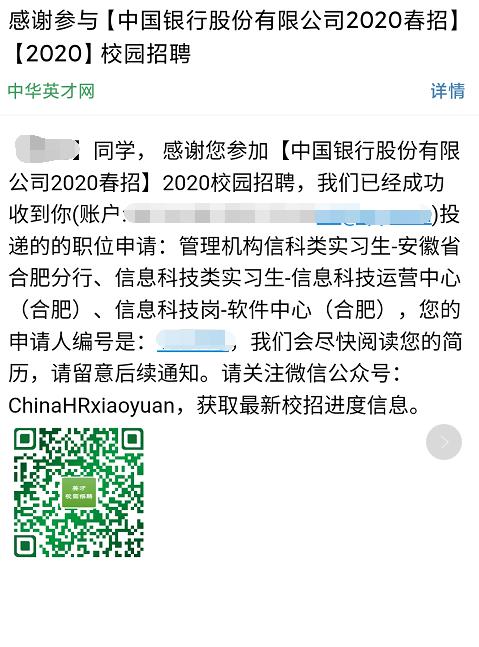 > [安徽]2020年中国银行安徽省分行春招投递职位申请反馈通知