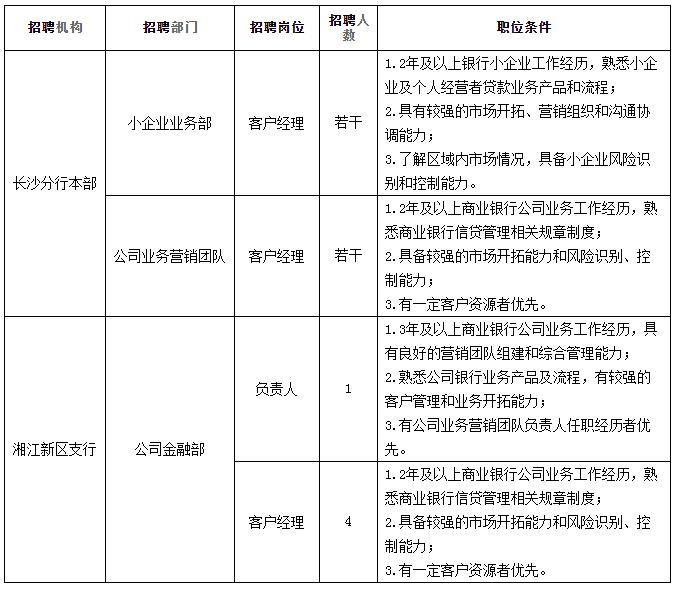 为适应未来业务发展需要,现面向社会诚聘金融人才,我们将为每位加盟的员工构建良好的职业生涯发展规划,提供业内具有竞争力的薪酬福利待遇,热忱欢迎有识之士和专业英才加入,共同开创独具特色的浙商银行长沙分行发展之路,成就自我职业梦想。