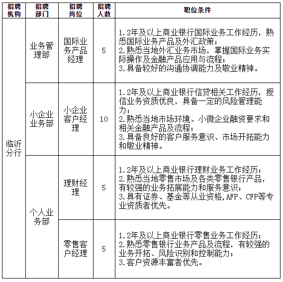 浙商银行临沂分行是济南分行设立的第4家二级分行,于2017年4月开业。开业以来,临沂分行秉承服务临沂经济发展大局的宗旨,各项业务稳健发展,内部管理扎实有效,金融服务水平持续提升。因业务发展需要,现面向社会诚聘金融英才,我们将为每位员工提供广阔的发展平台及优厚的薪酬福利待遇,欢迎有志之士加盟,携手共创美好未来。