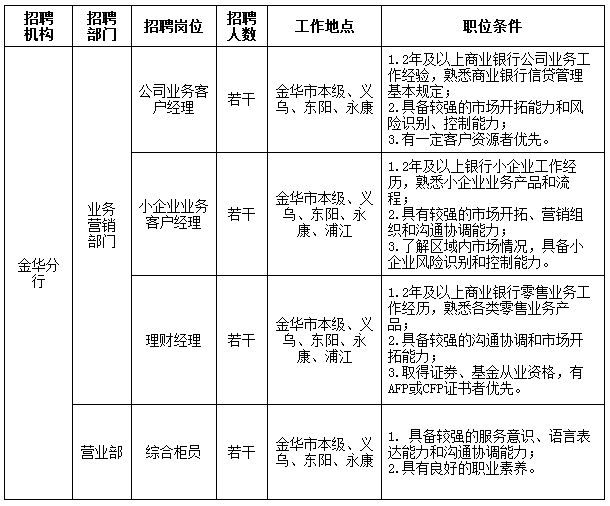 浙商银行金华分行于2017年1月6日正式开业,是金华地区唯一一家全国性股份制银行的一级分行。现因业务发展需要,面向社会诚聘金融英才。我们将为每位加盟的员工构建良好的职业生涯发展规划,提供业内具有竞争力的薪酬福利待遇,热忱欢迎有志之士和专业人才加入,携手共创美好未来!