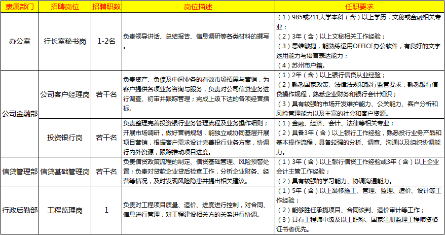 因业务发展需要,现面向社会公开招聘相关岗位人才,热忱欢迎具有创新精神、敢于接受挑战的有志、有识之士加盟,实现张家港农商银行与您的共同发展!