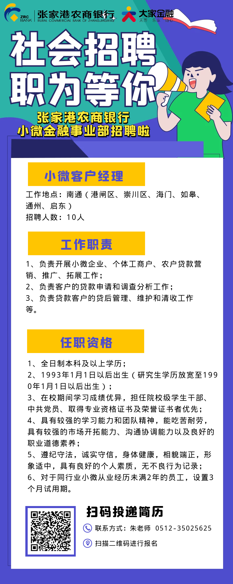 [江苏]2021年张家港农商银行招聘南通地区小微客户经理公告