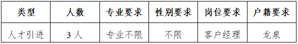 为深入实施人才强行战略,造就一支数量充足、质量优良、结构合理并具有竞争力的营销队伍,满足业务持续稳健发展需要,龙泉农商银行向社会公开引进有实战经验的营销型人才,诚邀各路精英,共同打造龙泉人民的满意银行,现将有关事项公告如下: