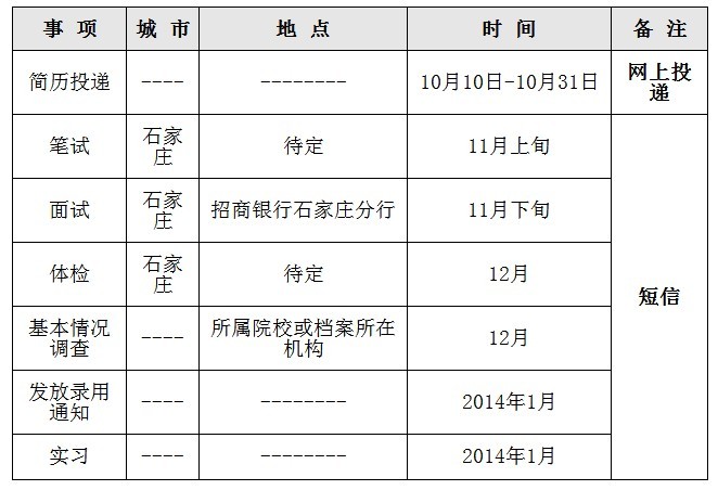 现根据业务发展与人才培养的需要,招商银行石家庄分行面向全国高校诚邀2014年应届毕业生加盟,具体条件如下: