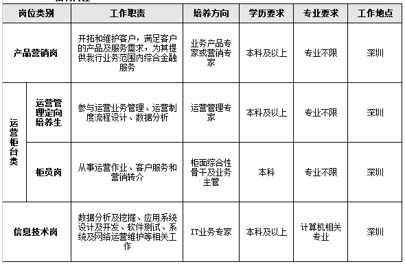 秉承“文化育人、事业留人、制度选人”的理念,深圳分行一直为广大青年学生的发展成长创造良好环境,为招行系统培养了一大批优秀的管理骨干和业务骨干。为加强员工队伍建设,为深圳分行可持续发展提供充足的人才资源,现面向全国高校招聘2018届全日制普通高等院校毕业生和海外归国留学生,具体如下: