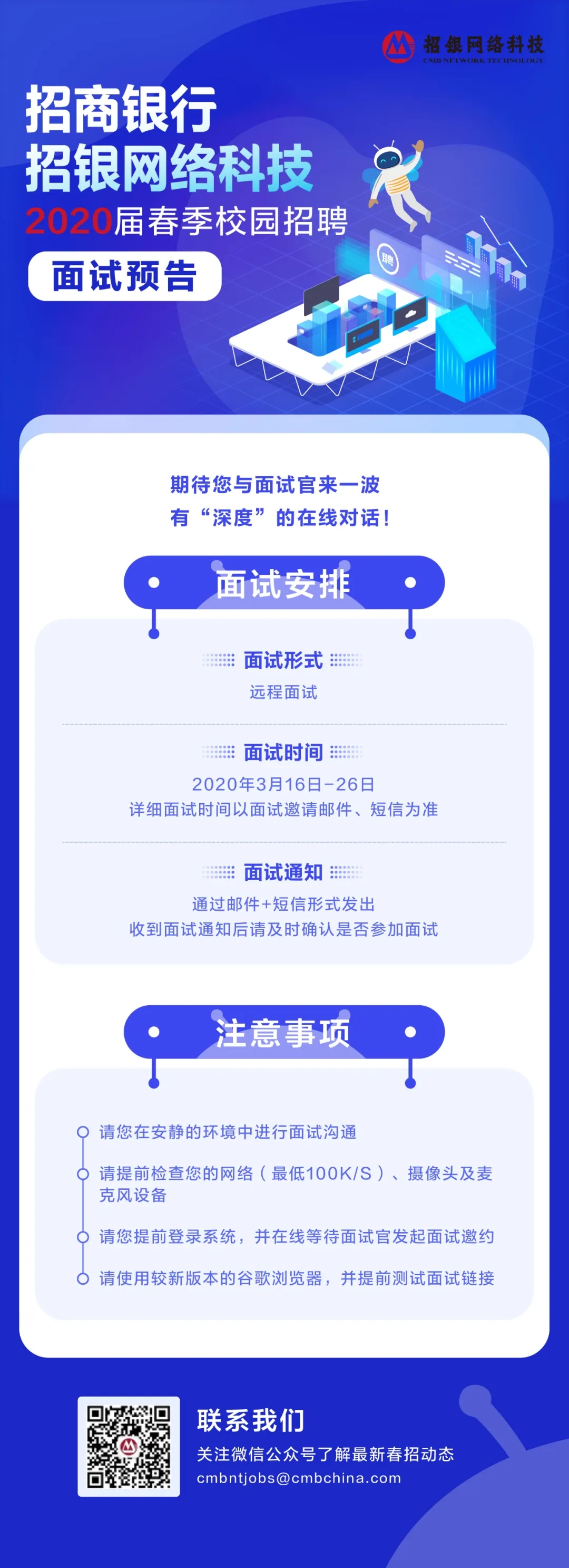 > 2020招商银行招银网络科技春季校园招聘面试预告