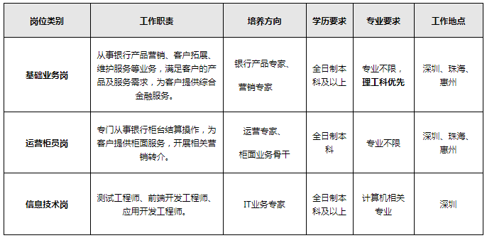 秉承“文化育人、事业留人、制度选人”的理念,深圳分行一直为广大青年学生的发展成长创造良好环境,为招行系统培养了一大批优秀的管理骨干和业务骨干。为加强员工队伍建设,为深圳分行可持续发展提供充足的人才资源,现面向海内外高校招聘2021届全日制普通高等院校毕业生和海外归国留学生,具体如下: