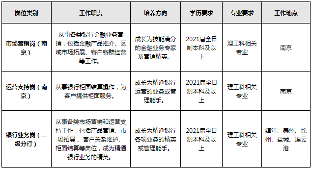 二十四年来,招商银行南京分行始终坚持稳健经营,规范管理,从严治行的方针,力求为员工提供完善的培训体系、公平的竞争机制、广阔的职业平台、多样的员工关怀。随着事业的发展,我们竭诚欢迎有志于金融改革创新、勇于接受挑战、德才兼备的2021届应届优秀学子加盟,共创招行美好未来,具体如下: